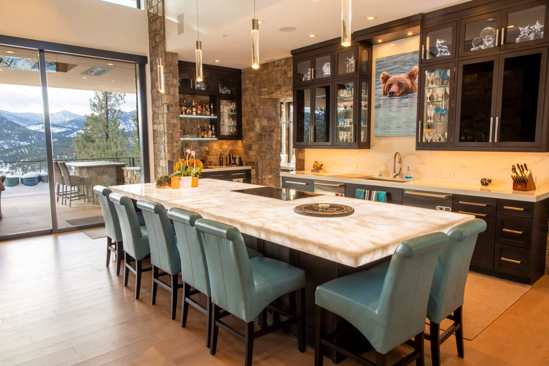 Cabinet lighting above, under, and inside creates layered effects, all controlled by custom lighting scenes.