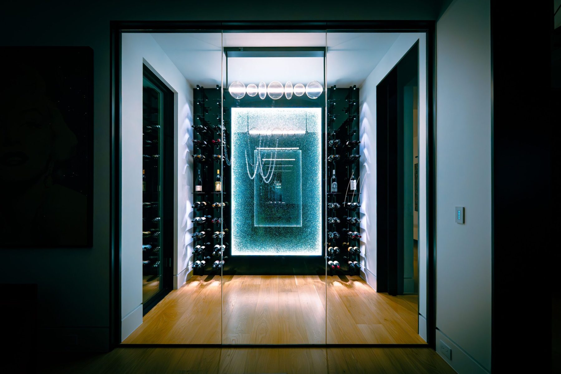 Every wine bottle is subtly lit with this custom wine rack and gorgeous illuminated glass