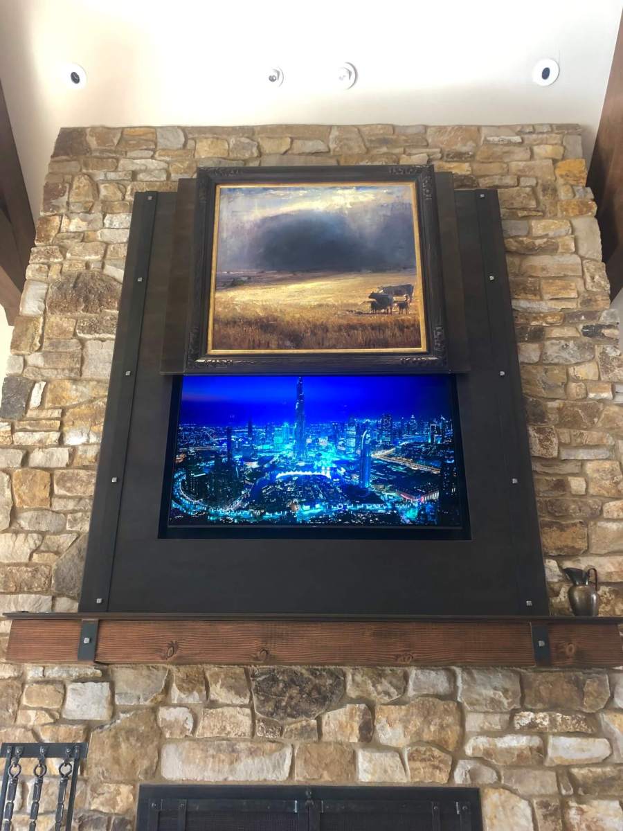 Now you see it — the motorized artwork slides away to reveal the hidden TV.