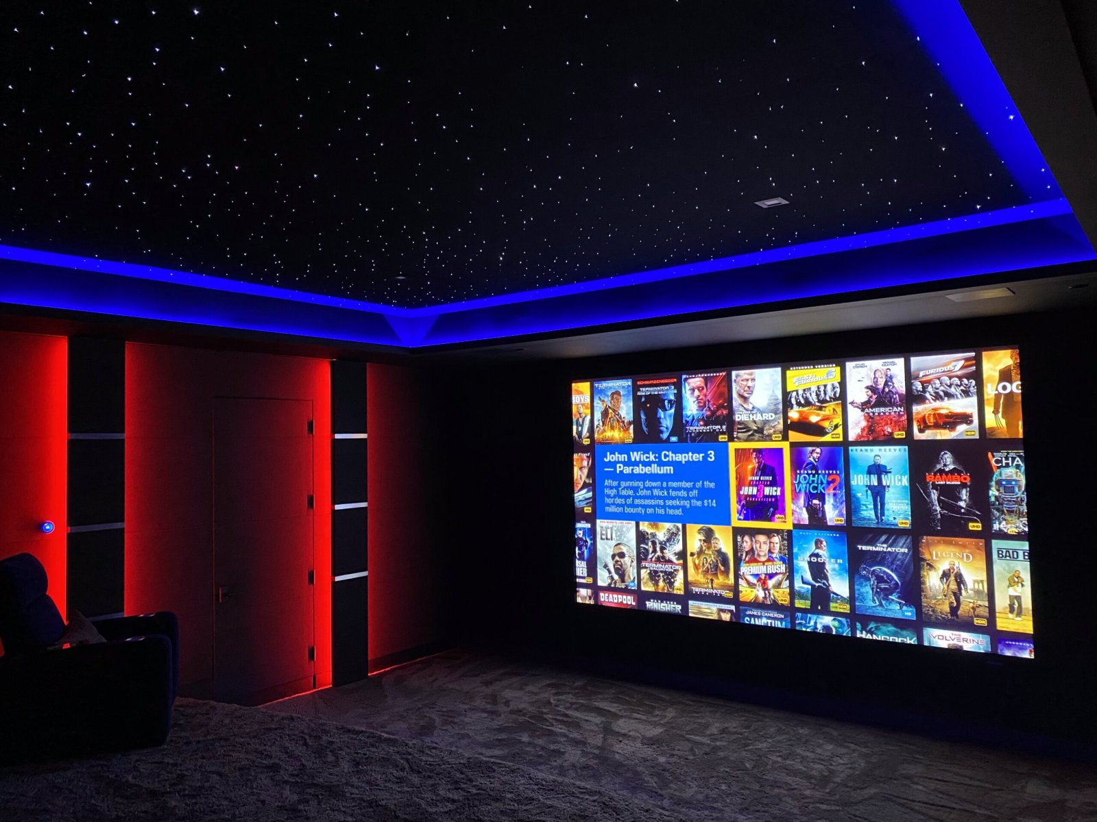 Modern home theater with color changing LED lighting and constellations worked into the custom star ceiling.