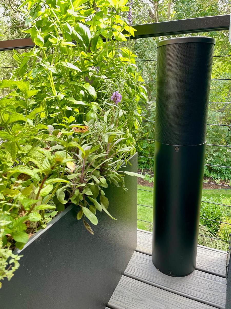 Outdoor tower speakers bring concert-quality sound to this home’s patio and backyard spaces.