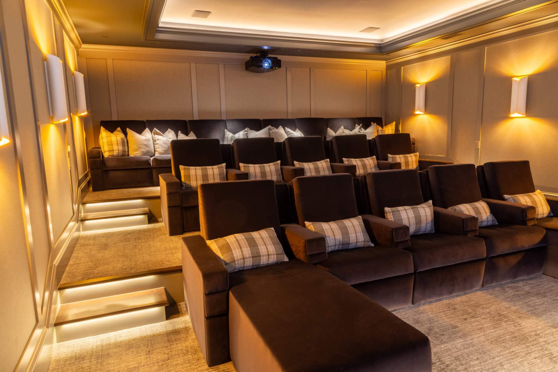 Three tiers of seating, indirect lighting, and movie scene control make this home theater both luxurious and immersive.
